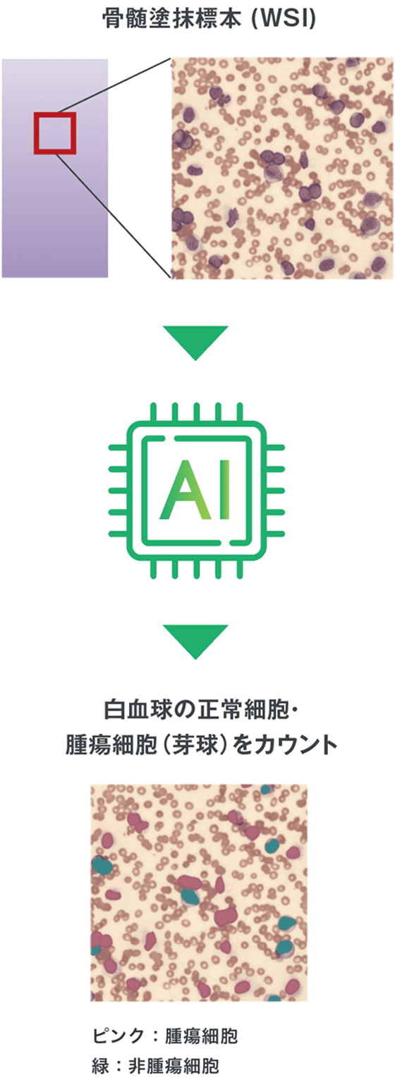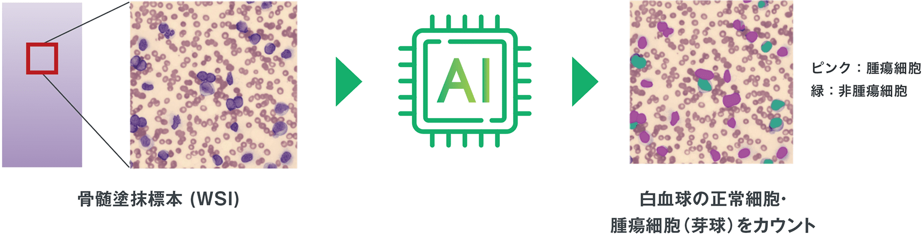 白血病の治療において、抗がん剤投与後に骨髄液を採取し芽球(白血病細胞)がどれぐらい残存しているかを確認することは重要となりますが、目視で膨大な細胞を確認するのは限界があり、医師の負担も大きい状況です。