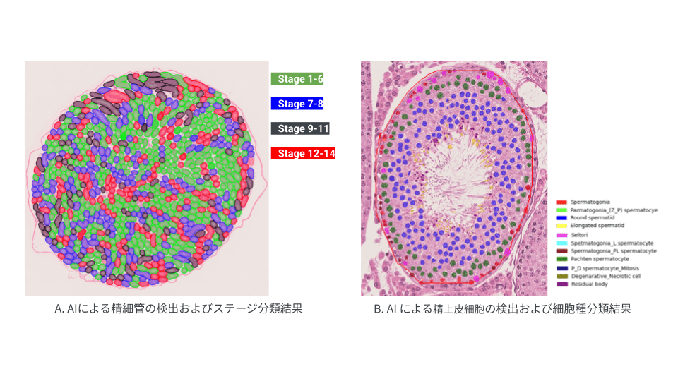複数の施設で作成された精巣の組織標本を教師データとして学習させ、精細管※3の検出・ステージ分類とともに、精上皮細胞※4を検出・細胞種ごとに定量するAIモデルを構築しました(図4)。これによって、目視では半定量的評価であった精細管や細胞種ごとの数の増減について、AIを用いた定量的な評価の実現とともに、より微細な変化を検出できる可能性を示しました(図5)。このAIモデルによる精細管の4段階のステージ分類は平均正解率93%、精上皮細胞の細胞種分類では平均正解率86%という高い精度を示しました(。