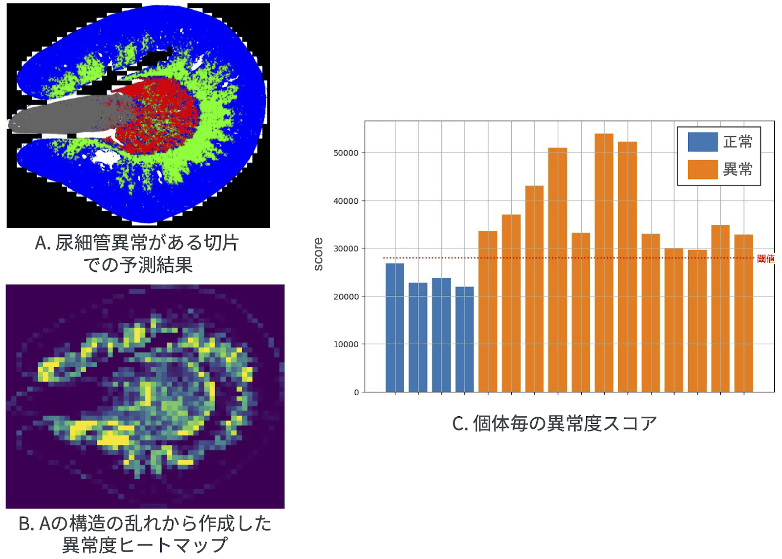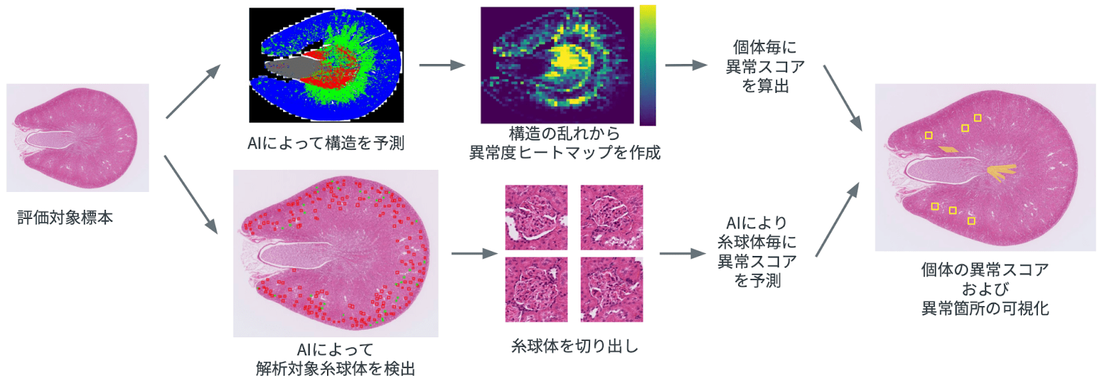 (1)腎臓全体の組織構造を予測し、正常構造からの逸脱度合いから尿細管の異常を判定(細胞密度の低下や組織構造が乱れなどを「異常」と判定)