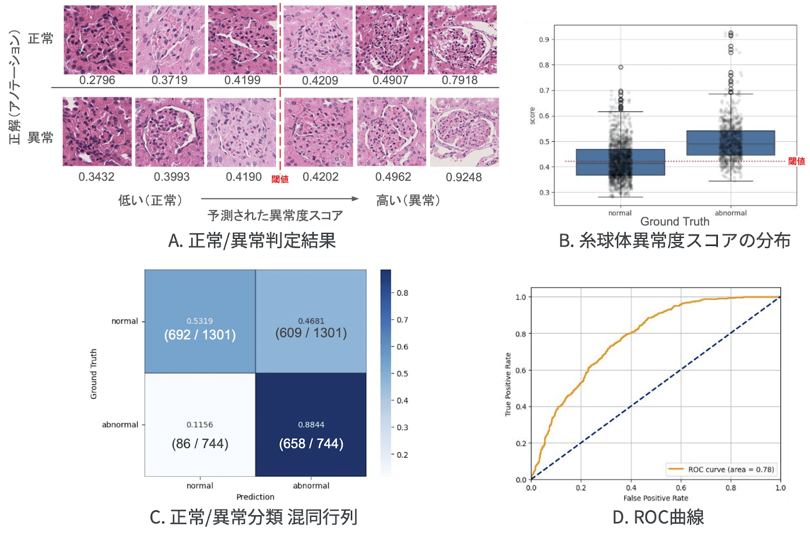 図3.糸球体の正常/異常の判定。評価用データの糸球体異常は5段階評価のうち最も変化が軽微なgrade1の病変であったが、正常データのみを学習に使用したモデルで、上記の精度での分類が可能であった。