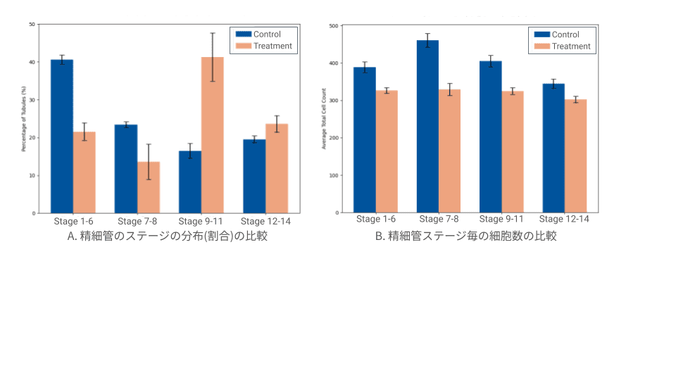 図5. 本手法を用いてコントロール群(紺)とパソロジストによる鏡検で病変が見つかった薬剤投与群(橙)を比較した結果。精細管はStage1-6、7-8の割合が減少しStage9-11、12-14が増加、精細管あたりの細胞数は一貫して減少する様子が見られた。