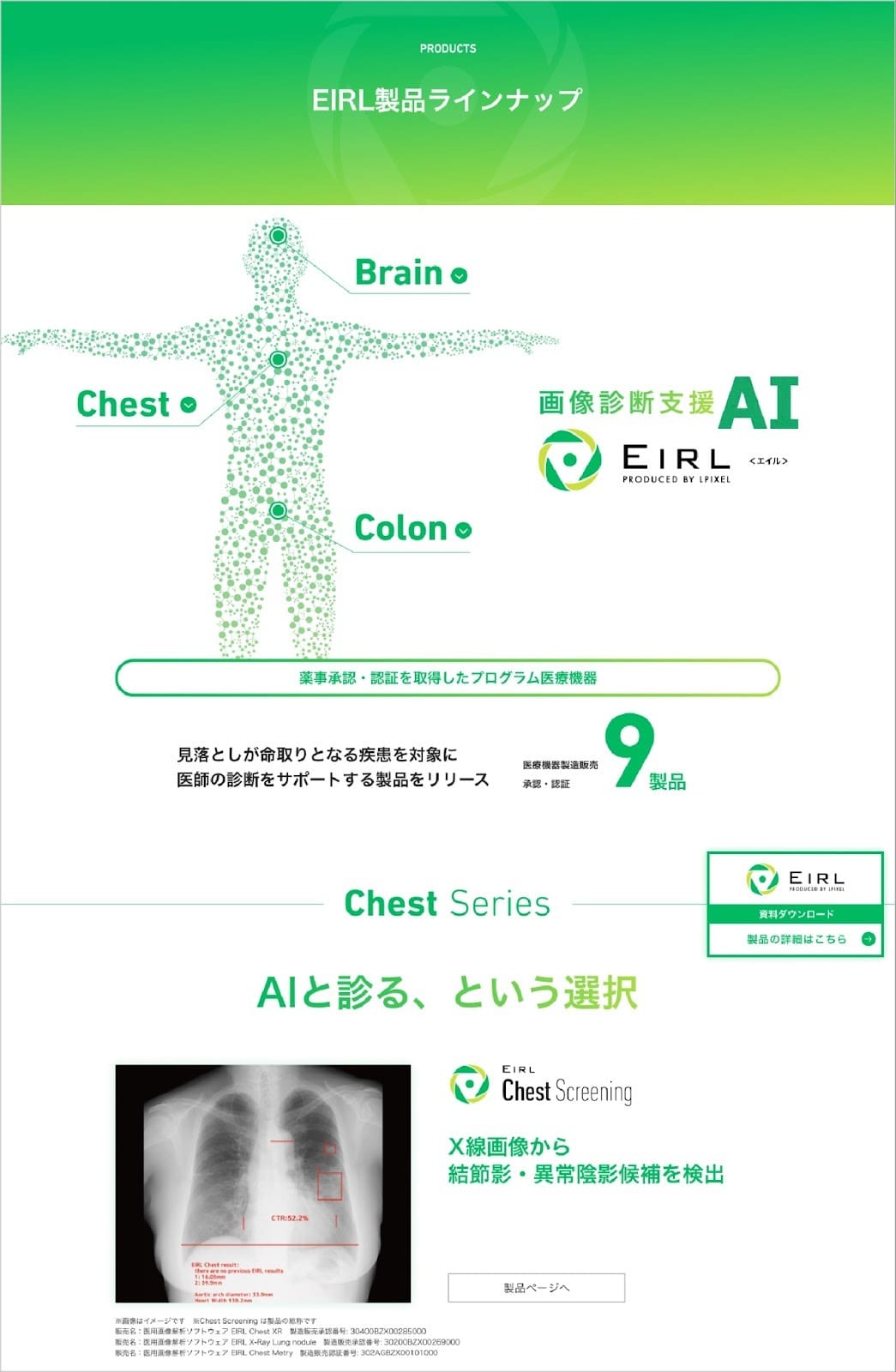リリースされた全製品をINDEX化したページを新設。ユーザーが目的に合った製品をスマートに探せるよう、各製品のサマリーを明記。部位シリーズにおいてEIRLが考える提供価値を示し、医療AIの未来を拓く製品群を紹介。